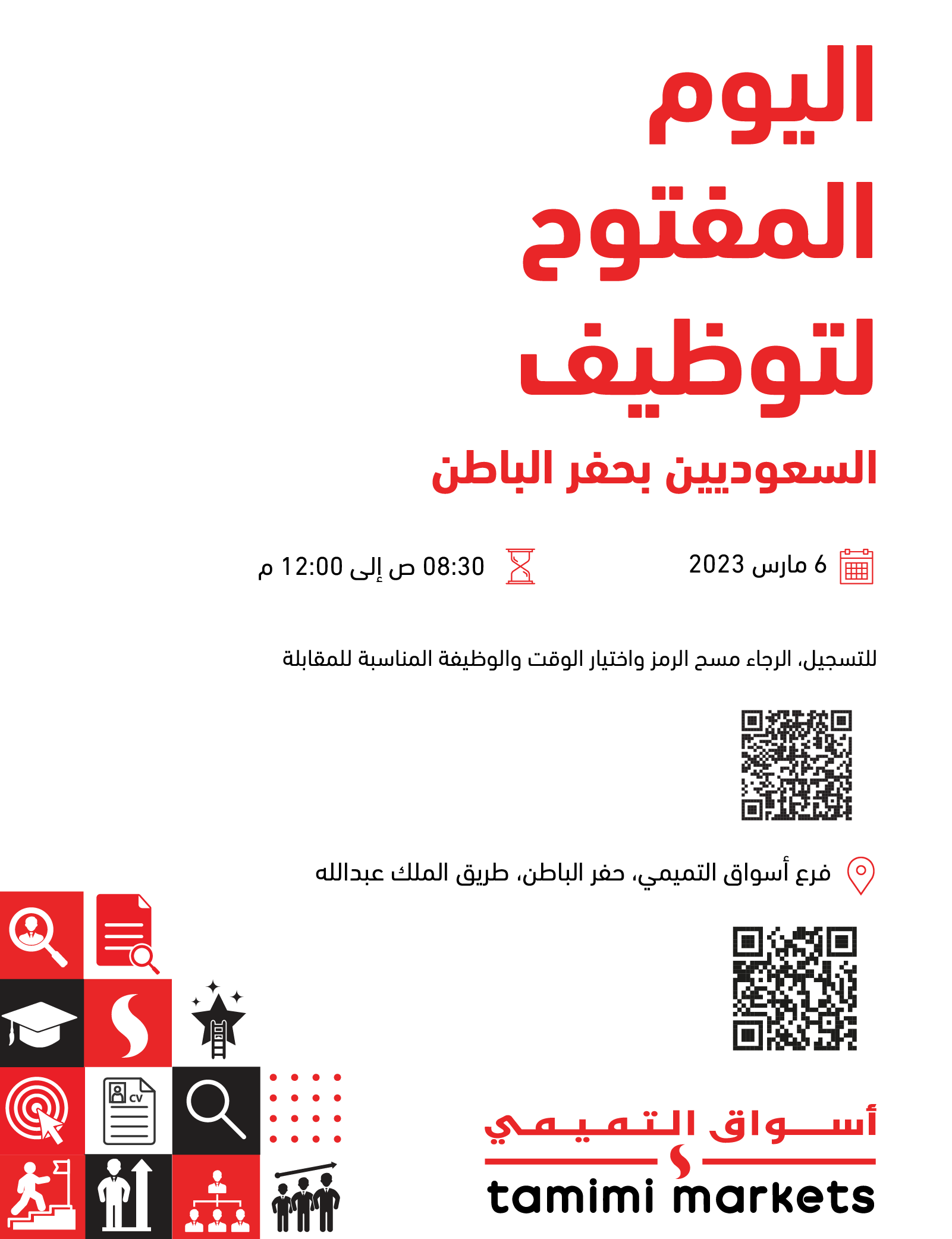 شركة أسواق التميمي تعلن بدء التسجيل في اليوم المفتوح للتوظيف بحفر الباطن لمختلف المؤهلات