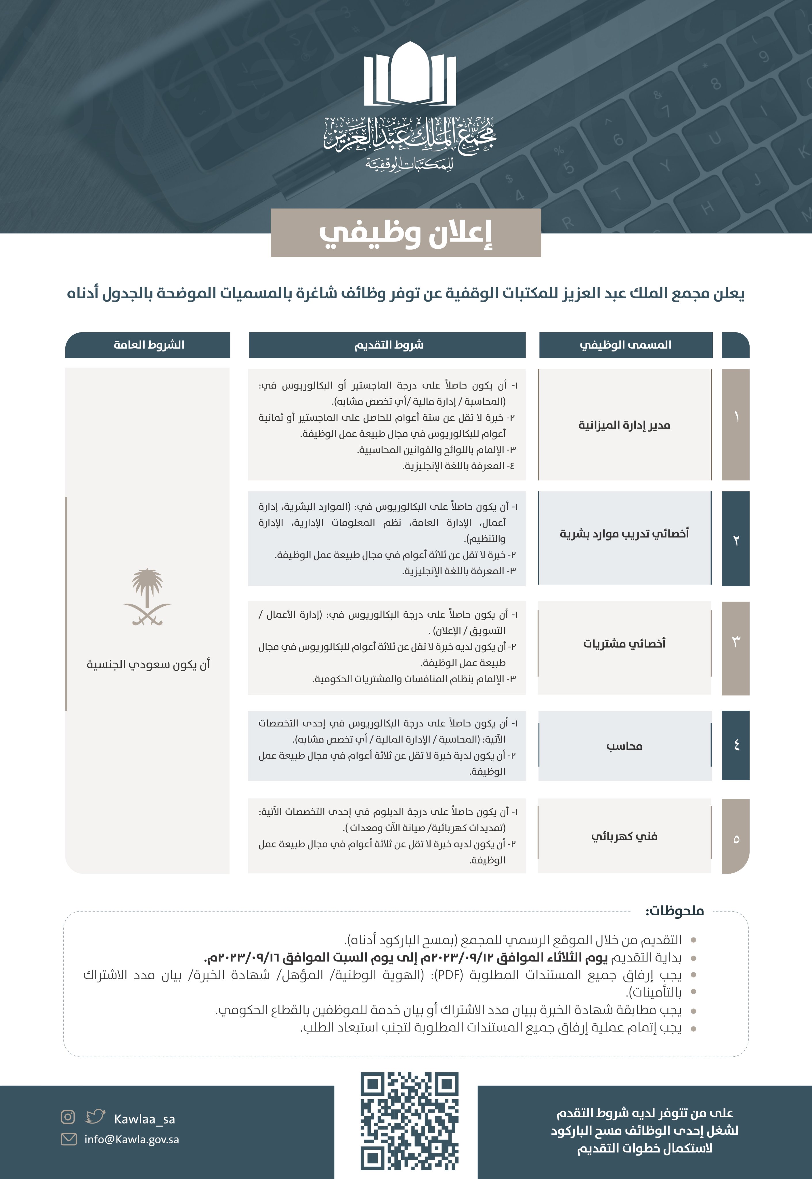 مجمع الملك عبدالعزيز للمكتبات الوقفية يوفر وظائف شاغرة لحملة الدبلوم فأعلى بمختلف التخصصات