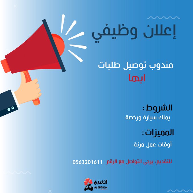 وظيفتك عليناتعلن (أسواق الغنيم) عبر حسابها الرسمي على (تويتر) عن توفر وظائف شاغرة بمسمى ( مندوب توصيل طلبات ) للعمل في (أبها)، واشترطت ان يكون المتقدم سعودي الجنسية، وذلك وفقاً للتفاصيل والشروط الآتية.