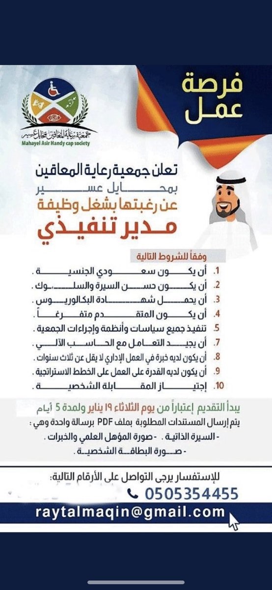 وظيفتك عليناتعلن (جمعية رعاية المعاقين بمحايل عسير) عبر حسابها الرسمي على (تويتر) عن توفر وظائف شاغرة بمسمى ( مدير تنفيذي ) للعمل في (محايل عسير)، واشترطت ان يكون المتقدم سعودي الجنسية، وذلك وفقاً للتفاصيل والشروط الآتية.