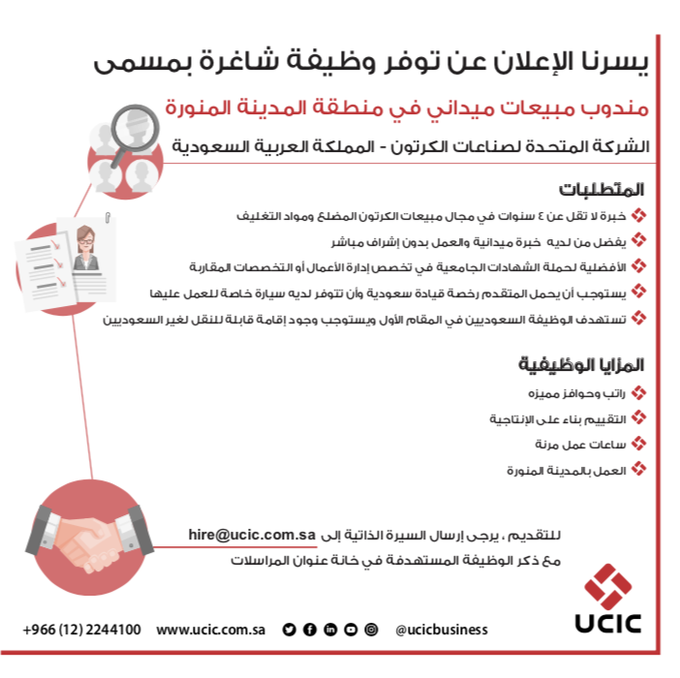 وظيفتك عليناتعلن (الشركة المتحدة لصناعة الكرتون) عبر حسابها الرسمي على (تويتر) عن توفر وظائف شاغرة بمسمى ( مندوب مبيعات ميداني ) للعمل في (المدينة المنورة)، واشترطت ان يكون المتقدم سعودي الجنسية، وذلك وفقاً للتفاصيل والشروط الآتية.