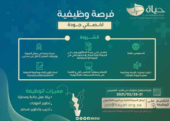 جمعية حياة الخيرية توفر وظيفة بمجال الجودة لحملة الدبلوم فما فوق بالمدينة المنورة