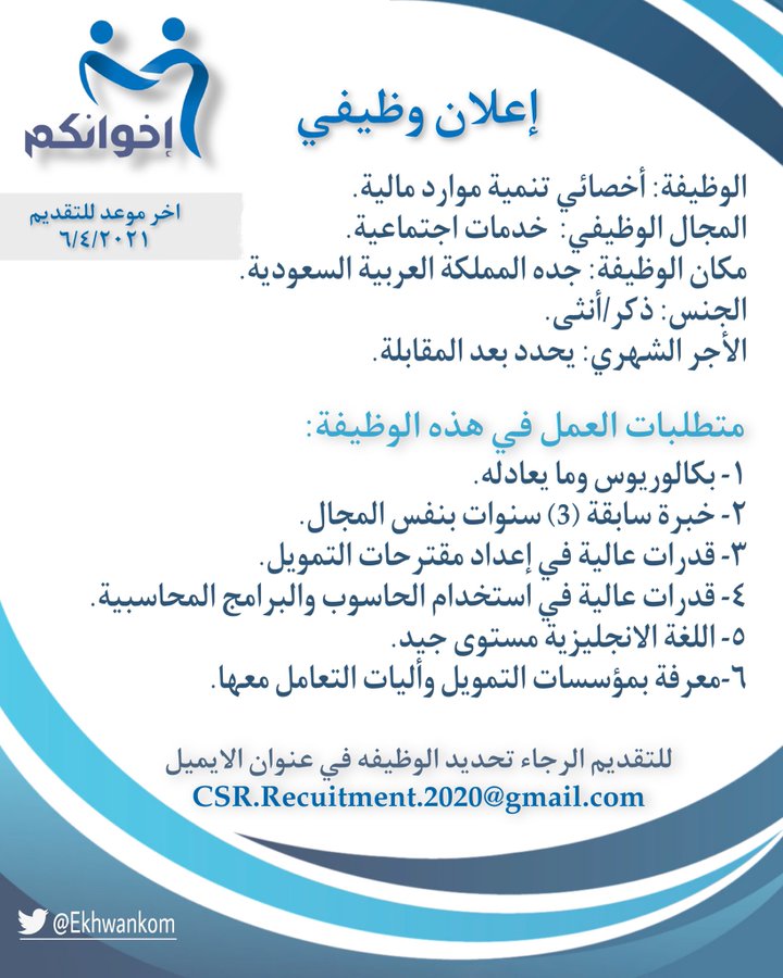 وظيفتك عليناتعلن (جمعية إخوانكم) عبر حسابها الرسمي على (تويتر) عن توفر وظائف شاغرة بمسمى ( أخصائي تنمية موارد مالية ) للعمل في (جدة)، واشترطت ان يكون المتقدم سعودي الجنسية، وذلك وفقاً للتفاصيل والشروط الآتية.