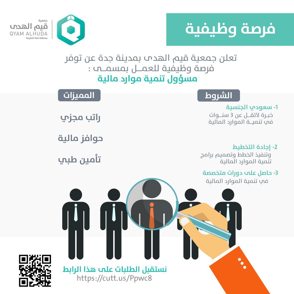 تعلن جمعية قيم الهدى بمحافظة جدة عن توفر وظيفة شاغرة بمجال المالية لذوي الخبرة، واشترطت ان يكون المتقدم سعودي الجنسية وذلك وفقاً للتفاصيل الآتية:
