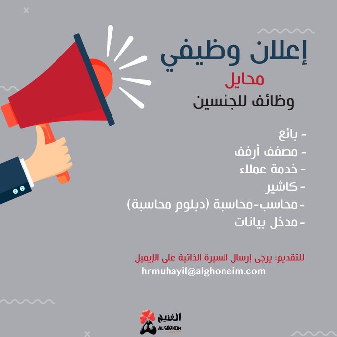 وظيفتك عليناتعلن (شركة أسواق الغنيم) عبر حسابها الرسمي على (تويتر) عن توفر وظائف شاغرة لحملة الثانوية العامة فما فوق للعمل في (محايل)، واشترطت ان يكون المتقدم سعودي الجنسية، وذلك وفقاً للتفاصيل والشروط الآتية.