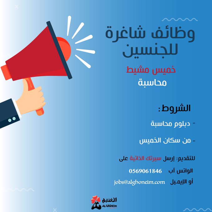 وظيفتك عليناتعلن (شركة أسواق الغنيم) عبر حسابها الرسمي على (تويتر) عن توفر وظائف شاغرة لحملة الدبلوم فما فوق بمسمى ( موظف محاسبة) للعمل في (خميس مشيط)، واشترطت ان يكون المتقدم سعودي الجنسية، وذلك وفقاً للتفاصيل والشروط الآتية.