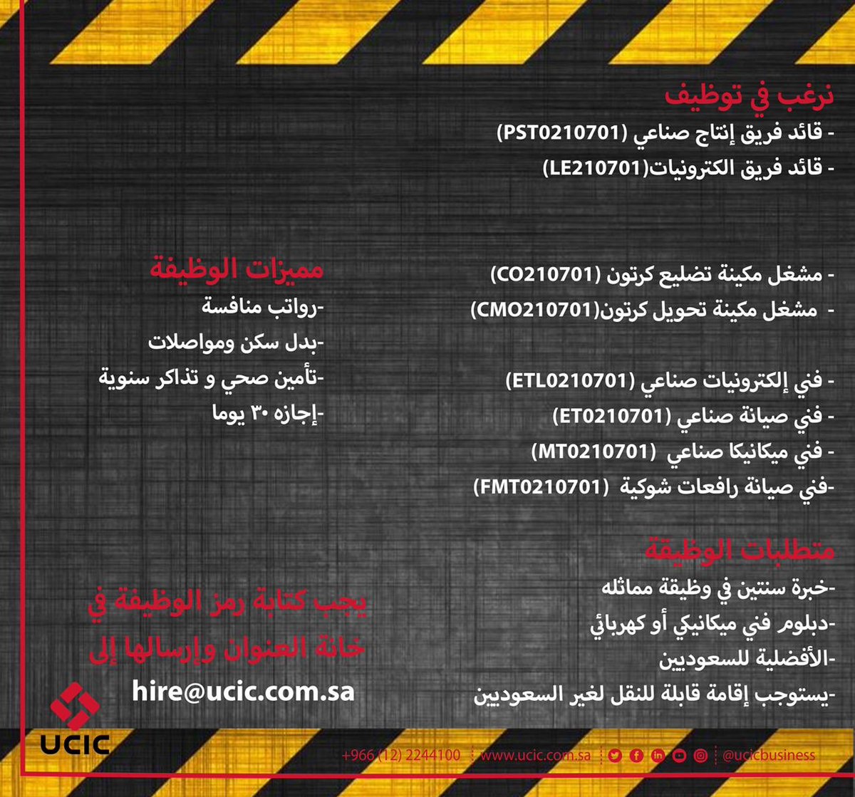 وظيفتك عليناتعلن (الشركة المتحدة لصناعة الكرتون) عبر حسابها الرسمي على (تويتر) عن توفر وظائف شاغرة لحملة الدبلوم بعدة مسميات للعمل في (جدة)، وذلك وفقاً للتفاصيل والشروط الآتية.