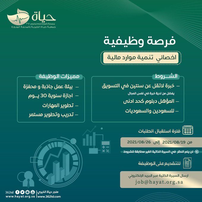 جمعية حياة الخيرية تعلن عن توفر وظيفة إدارية لحملة الدبلوم فما فوق بالمدينة المنورة