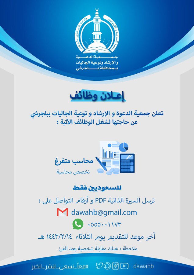 وظيفتك عليناتعلن (جمعية الدعوة والإرشاد وتوعية الجاليات في بلجرشي) عبر حسابها الرسمي على (تويتر) عن توفر وظائف شاغرة بمجال المحاسبة بمسمى ( محاسب) للعمل في (بلجرشي)، واشترطت ان يكون المتقدم سعودي الجنسية، وذلك وفقاً للتفاصيل والشروط الآتية.
